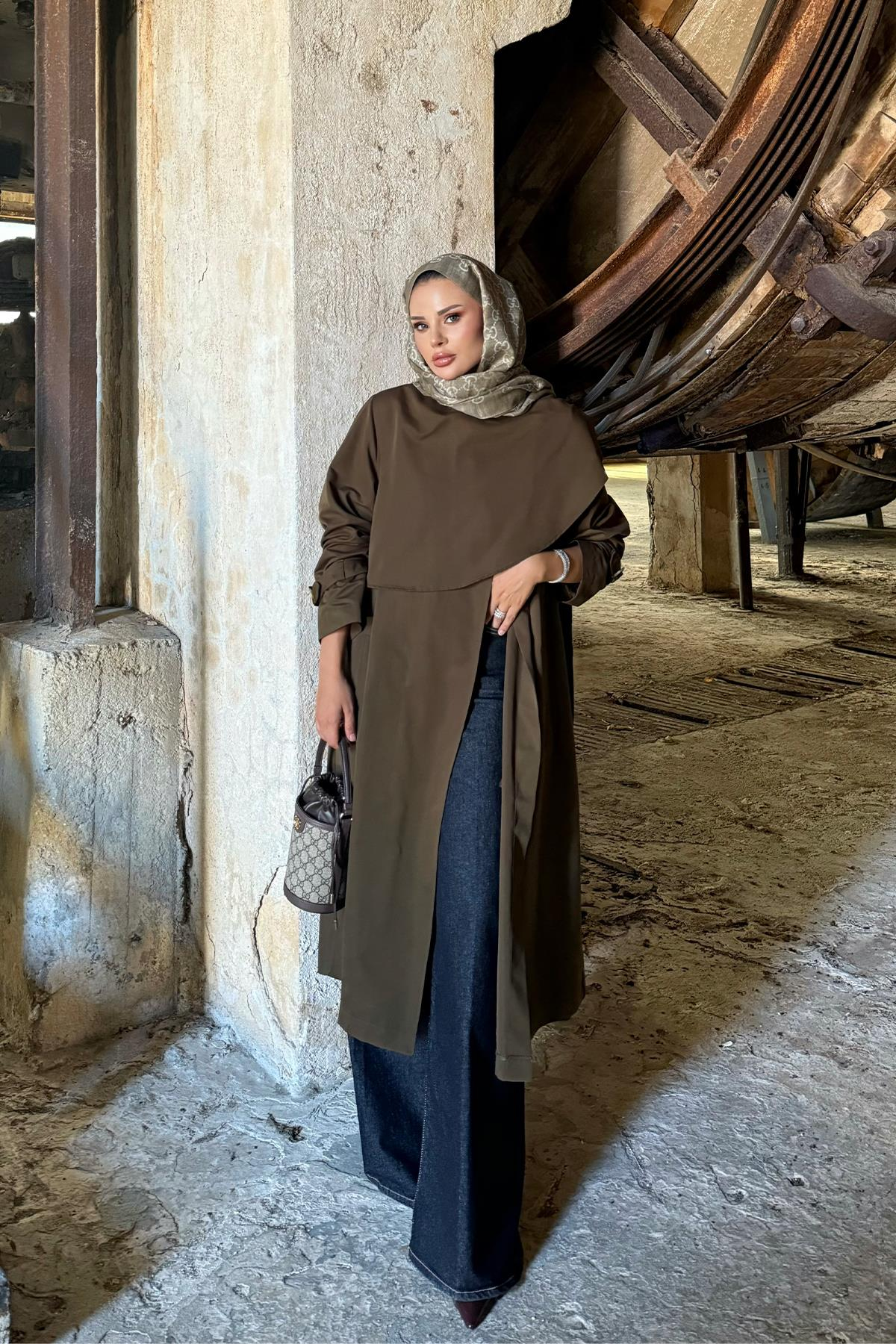 BROŞLU ŞAL YAKA TRENÇKOT KOYU HAKİ