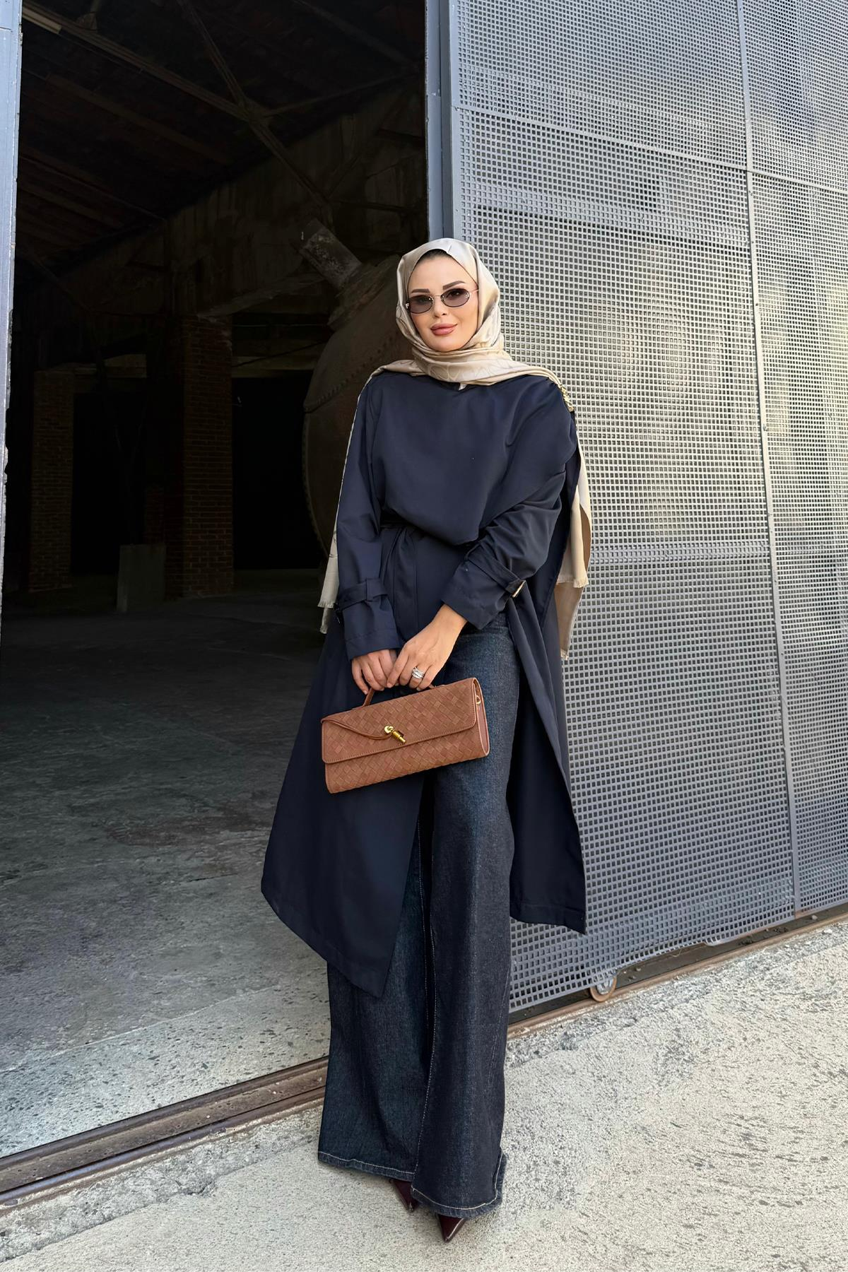 BROŞLU ŞAL YAKA TRENÇKOT LACİVERT