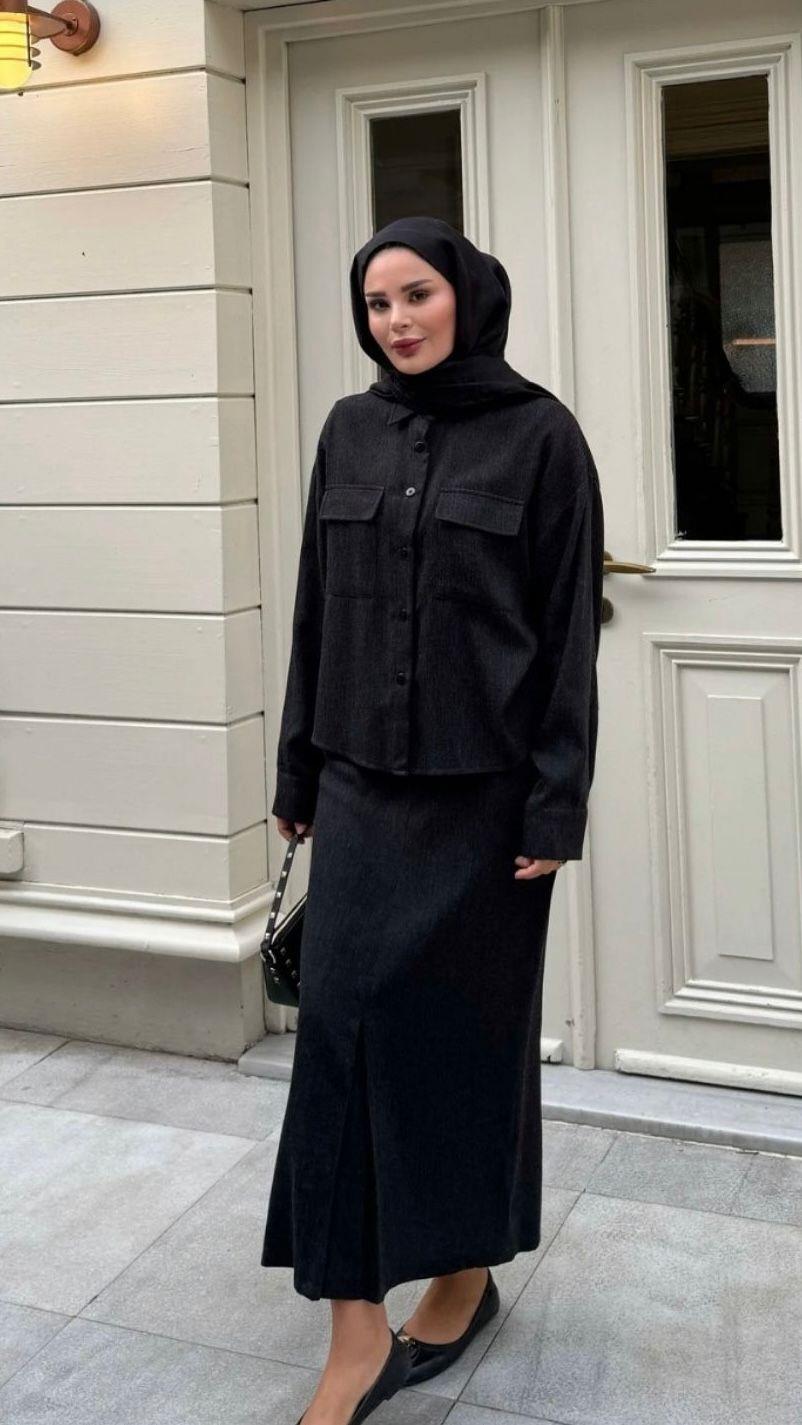 Oduncu Kumaş Gömlekli Etekli Takım Siyah